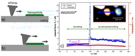Concept of Nanoparticle Manipulation by pushing the nanoparticle from the side. During the manipulation, two stages can be distinguished: (a) the AFM tip approaches the particle and the lateral force signal originates solely from the tip/substrate interface. (b) Once the tip reaches the nanoparticle and starts pushing it, the lateral force signal increases and can be attributed to both tip/substrate and particle/substrate friction. Subtracting the two lateral force levels then gives access to only the friction of the nanoparticle. (c) Example of a nanoparticle manipulation. The overlay image of the inset shows the nanoparticle, before and after it has been manipuated by the AFM tip along the direction indicated by the arrow. The main part of the figure shows the lateral force trace. The lateral force signal before the tip reaches the particle (tip sliding) can be used as reference to extract the absolute friction of the sliding nanoparticle when pushed by the tip (nanoparticle sliding). Additionally, also the topography signal recorded during the manipulation of the nanoparticle is shown, which is flat on a sub-nanometer level.