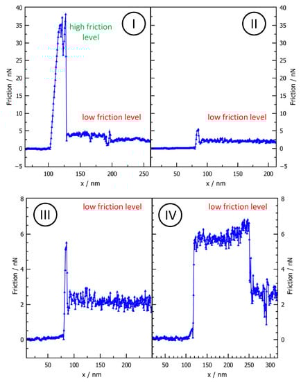 Similar effects have also been observed for the NaCl-Particles on HOPG. This is illustrated in Figure 3, where a nanoparticle with a contact area of = 28,750 nm has been consecutively manipulated three times as shown by the panels I-IV in Figure 3 (Please note that panels II and III show the same data, albeit using a different y-scale). The result reveals distinct friction levels: For the first manipulation, the lateral force signal (Figure 3I) starts with a pronounced peak of approximately 35 nN, which is only stable for approximately 20–30 nm before the lateral force experiences a sudden drop to a level below 5 nN. But also on this lower level, friction does not remain constant but instead switches five more times with friction changes in the nN-range. We checked if the sudden friction changes can be related to topography features of the surface or the particle dimension but no apparent correlation was found. Therefore, the friction variations must be correlated to intrinsic changes of the interface conditions.