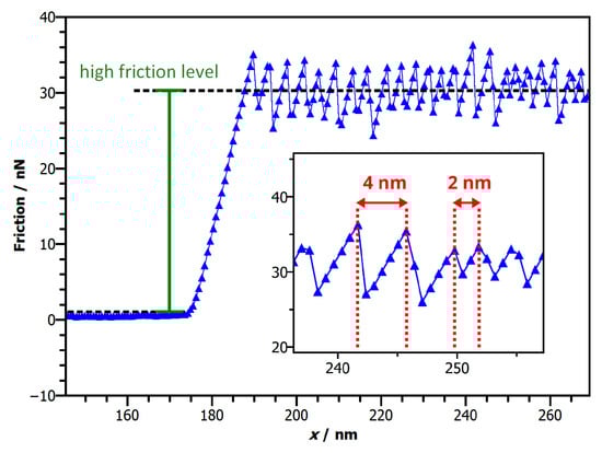 Figure 3 already highlights two main features that are important in the further course of this work. The first one is the switching between different levels in the lower friction range. This effect was not only observed for the example shown in Figure 3 but was a frequent occurrence throughout our measurements of a larger number of nanoparticles. Interestingly, we found that friction can indeed change back and forth between higher and lower levels in this range (see also Figure 3). The significance of the second main effect (i.e., the existence of a high friction level) is not immediately clear from Figure 3. Here, the initially high friction level might alternatively be interpreted as a static friction peak, despite the fact that friction remains on the high level for at least a few nm. However, the importance of this peak becomes clearer in Figure 4, which shows friction measurements for a previous manipulation of this nanoparticle. Here, friction remains on the elevated level for a distance of approximately 80 nm. Therefore, the high friction level of Figure 3 must rather be considered as a short-lived manifestation of a characteristic sliding state than as a static friction peak (i.e., an aging related threshold force to overcome before sliding). As we will see later on, this classification, which was also applied for other nanomanipulations is further justified by the consistence of the resulting friction versus area scaling, which results in a distinct branch with .