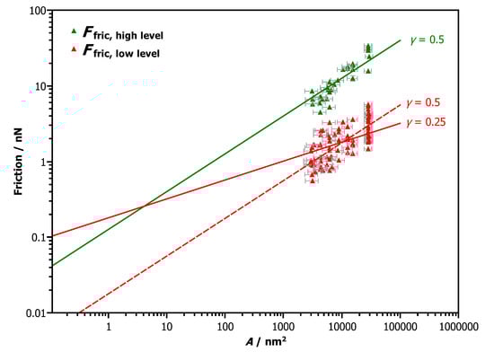 All the previously discussed effects must be considered when analyzing the friction versus area scaling based on our nanomanipulation experiments, which consisted of 85 manipulations of 30 nanoparticles. For each nanomanipulation we have analyzed the friction traces recorded during particle manipulation as indicated in Figure 3. The results show two distinct branches of the friction versus area scaling (Figure 5). The low friction branch is well separated from the high friction branch and has a broader spread of friction values.