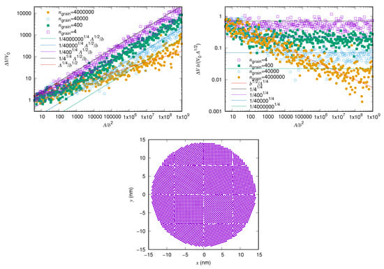 Figure 6 shows the rescaled corrugation as a function of the contact area for polycrystalline interfaces with grains of various sizes. The lines in the figure show the expected behaviour from Equation (1). For small size, the crystals have only one grain and follow the scaling of circular crystals, with exponent , indicated by the red line. For larger particles, the number of grains grows linearly with the number of atoms, as the grain size is constant, that is, . Hence the corrugation for the larger particles scales as . This scaling is indicated by the other lines in the figure and fits well to the numerical results over more than 8 decades.