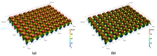 | Sides (bx, by) (µm) | Height (Vs. Underlying Plateau 2) (µm) | Period (Px, Py) (µm) | Sides (bx, by) (µm) | Height (Vs. Underlying Plateau 3) (µm) | Period (Px, Py) (µm) |