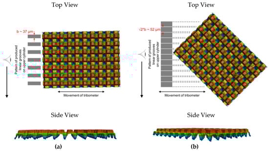 - Suh, M.S.; Chae, Y.H.; Kim, S.S.; Hinoki, T.; Kohyama, A. Effect of Geometrical Parameters in Micro-Grooved Crosshatch Pattern under Lubricated Sliding Friction. Tribol. Int. 2010, 43, 1508–1517. [Google Scholar] [CrossRef]