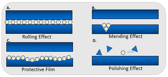 Coconut oil is considered one of the most stable oils. Coconut oil belongs to the lauric oils group. Lauric acid is the most abundant fatty acid found in coconut oil. One of the main drawbacks of vegetable oils is poor oxidation and thermal stability []. Therefore, at higher loads, there is a performance drop in the lubricants. Nanoparticles have been used as friction modifiers due to their extremely small size, which allows them to slide into the two metals’ contact area. This allows the nanoparticles to act as a rolling bearing in the interface []. Other proposed mechanisms for nanoparticles in lubricants include protective film, mending effect, and polishing effect, which are all shown in Figure 1. The addition of nanoparticles helps with the wear and friction properties of the lubricant. Silica and copper oxide nanoparticles are efficient at room temperature, therefore no induction period is needed to see improvement in tribological properties. Peng and co-workers analyzed the tribological properties of SiO2 in liquid paraffin using a ball-on-ring wear tester, and they demonstrated that SiO2 helped lower wear and friction when compared to the base paraffin []. The main issue is compatibility of the nanoparticles and the base oil. Over long periods of time, the nanoparticles tend to sediment, making their tribological properties diminish [].