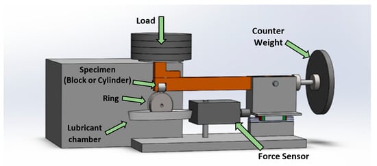 Sliding wear tests were performed using a custom made tribotester with two different configurations: A block-on-ring configuration to determine COF based on ASTM G-077-05 [], and a crossed-cylinder configuration to determine volumetric wear under extreme pressures based on ASTM G-83-96 []. A schematic diagram of the tribotester is shown in Figure 2. For the experiments, an oil bath chamber fixture was used. Basic characteristics of the materials are shown in Table 1. For the two configurations, nano-lubricants were placed in the oil bath chamber allowing constant lubrication, while the test ring rotated, covering it in lubricant due to centrifugal forces. All tests were run at a temperature of 25 °C, and 300 rpm, during 1800 s. For the block-on-ring experiments, a load of 40 N (corresponding to a contact pressure of ~106 MPa) was used. For the crossed-cylinder configuration, nano-lubricants with SiO2 and CuO with all concentrations were tested at 25 N, corresponding to a contact pressure of ~1.4 GPa. Wear was determined gravimetrically using an Mettler Toledo XS205DU electronic balance (Mettler-Toledo LLC, Columbus, OH, USA) to an accuracy of 0.01 mg. Prior to the gravimetric measurement of wear, cylinders were washed in soapy water, thoroughly rinsed in water, cleaned ultrasonically in ethanol for 20 min, and then left in an atmosphere-controlled room for 24 h to dry and thermally stabilize. Weight loss was converted into volume loss using the specific density of 8 g/cm3 for AISI 304 steel cylinders. The friction force was continuously recorded during each test. The sliding tests were repeated three times for reliability and reproducibility.