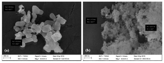 Morphology of the nanoparticles is shown in Figure 3. CuO nanoparticles with particle sizes between 50 and 300 nm can be observed in Figure 3a. A SEM micrograph of SiO2 nanoparticles is shown in Figure 3b. The morphology of the SiO2 nanoparticles was fairly spherical, with particle sizes between 25 and 35 nm.