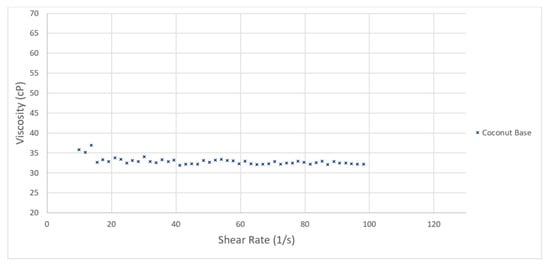 The rheological behavior of coconut base oil is shown in Figure 4. In this figure, the viscosity decreases at first, and after a shear rate of 50 s−1, the viscosity remains constant. Therefore, the viscosity experiences shear thinning before approaching a constant. Figure 5 and Figure 6 present viscosity at different concentrations of SiO2 in coconut oil. For concentrations of 0.75% and lower, the viscosity steadies out at lower values when compared to coconut without additives. For concentrations above 0.75% SiO2, the viscosity is greater than the base oil and it experiences shear thinning behavior until the end. It is evident that viscosity is dependent of the concentration of SiO2 in coconut base oil.