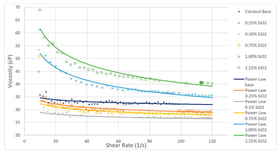 Effect of viscosity versus shear rate for SiO2 dispersion in various weight fraction in coconut base oil with the power law applied.