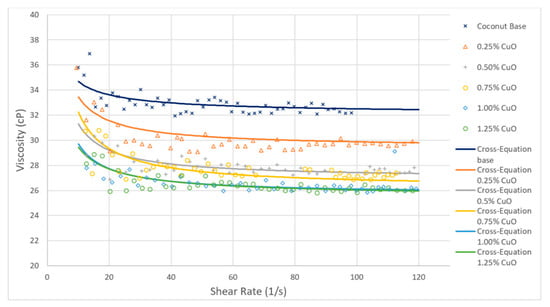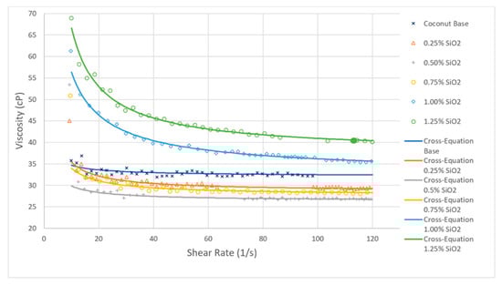 The Cross equation-fitted data for coconut base oil with SiO2 and CuO are shown in Figure 6 and Figure 8, respectively. The parameters for the empirical models are shown in Table 2, along with the root-mean-square error (RSME) and the error sum of squares (SSE).