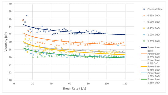 Effect of viscosity versus shear rate for CuO dispersion in various weight fraction in coconut base oil with the power law applied.
