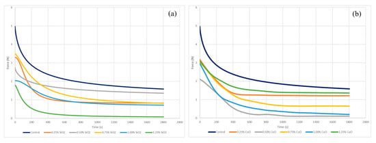 The tribological performance of coconut oil as a lubricant was evaluated with and without nanoparticles. The effect of nanoparticle concentration on the friction force with respect to time is shown in Figure 9. It was found that the friction force can be significantly reduced by the addition of nanoparticles into the coconut lubricant. The best results were obtained with the concentration of 1.25 wt % for SiO2 nanoparticles and 0.50 and 1.00 wt % for the CuO nanoparticles.