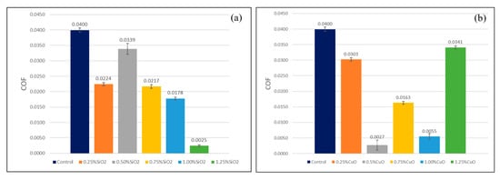 Coefficient of friction (COF) results for coconut oil modified with (a) SiO2 and (b) CuO nanoparticles.