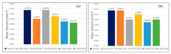 Mean volumetric wear of AISI 304 cylinders lubricated with coconut oil modified with (a) SiO2 and (b) CuO nanoparticles.