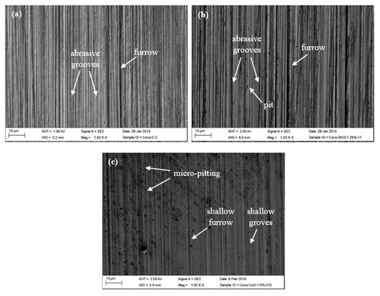 To improve the understanding of the wear mechanisms of the sliding surfaces, Figure 12 provides SEM micrographs of the wear scars produced during wear testing. Figure 12a presents a SEM micrograph of the wear scar produced during the wear test lubricated with coconut oil without additives. A rough surface can be observed, with several grooves and deep furrows uniformly distributed on the contact area. A SEM micrograph of the wear scar produced with coconut oil enhanced with 1.25 wt % of SiO2 nanoparticles is shown in Figure 12b. The wear track presents grooves and furrows, as well as some localized pits. Figure 12c shows a SEM micrograph of the wear scar produced with coconut oil enhanced with 1.0 wt % CuO nanoparticles. Using CuO nanoparticles at an optimum concentration, the wear scar shows shallow and smooth micro-grooves, along with shallow furrows which are formed by the small nanoparticles. Unlike the two previous conditions, micro-pitting was found in the wear scar.
