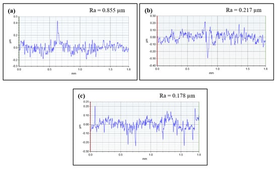Surface roughness profiles of the wear scars produced during wear testing are shown in Figure 13. The surface roughness profile of the wear scar produced during the wear test lubricated with coconut oil without additives is shown in Figure 13a. From the roughness profile, numerous asperities and a mean surface roughness value (Ra) of 0.855 µm can be seen. Figure 13b shows the roughness profile of the wear scar produced using coconut oil with SiO2 nanoparticles at 1.25 wt %. With the addition of SiO2 nanoparticles at 1.25 wt %, there was a decrease in the roughness compared with coconut oil without additives, resulting in a Ra value of 0.217 µm. After the wear test using coconut oil with the addition of 1.0 wt % CuO nanoparticles, the surface roughness on the wear scar resulted in a Ra value of 0.178 µm, as shown in Figure 13c.