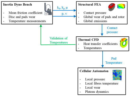 The proposed simulation methodology to investigate mesoscopic pad temperature distribution is presented in Figure 1. First (Figure 1, box 1), the brake system and the load conditions are set in terms of system pressure (p) and velocity (v), and then inertia dyno bench tests are performed. The global coefficient of friction (µ) and the macro-temperature of the pads and disc are registered in real-time during the experiments. The specific wear rates (kd and kp) are determined by weighing the disc and pads before and after the tests. Second (Figure 1, box 2), a FEA with a wear sub-routine is performed, knowing the cycle and the specific wear rate from the dyno tests. The FEA outputs are the contact pressure distributions during braking, the global wear, and the particle emissions. Third (Figure 1, box 3), the computed contact pressure distributions are used as input in a one-way coupled thermal-CFD analysis where the macro-temperature of the brake components are computed. The temperature computed with the thermal-CFD analysis can be compared with the temperatures measured in the dyno bench tests. Fourth, and last (Figure 1, box 4), the global temperature and the contact pressure distributions coming from the thermal-CFD and the FEA are used as boundary conditions for the CA approach [35]. With the CA, the methodology goes into the meso-scales to compute the local pressure distribution, the local wear, the plateau dynamics, and the local contact temperature. Each step of the simulation methodology is described in detail below.
