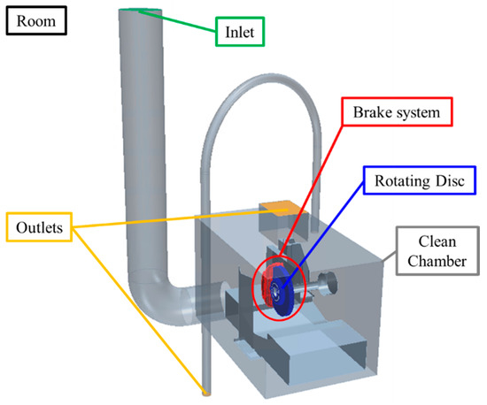 The inertia dyno bench used for the experimental test has been developed by Perricone et al. [36]. This setup is designed for tribology and airborne particles studies of disc brakes. The present work is not focused on particle emissions, so every detail regarding this are left out here. An illustration of the inertia dyno bench setup is shown in Figure 2. The setup consists of a clean chamber where the brake system is assembled. Air is taken from inside the climate-controlled room to ensure temperature and humidity conditions that are repeatable. The inlet flow rate is set to 850 m3/s, which corresponds to a velocity of about 5 m/s. Two walls inside the chamber entrance are used to avoid an excess of cooling on the side exposed to the air of the brake system. The disc axis is aligned with the inlet pipe axis. On the ceiling there are two outlets, one large outlet and one sampling pipe for the particle measurements.