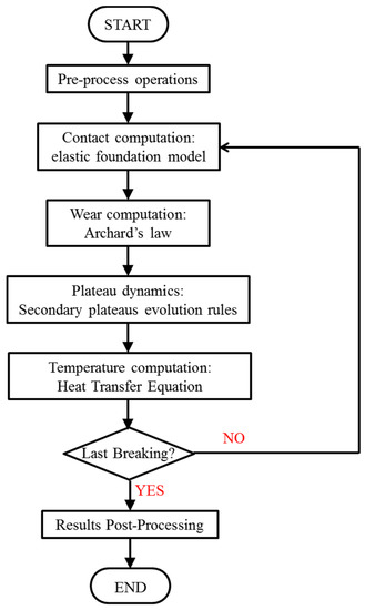 Starting from the work of Riva et al. [35], a CA approach has been further developed to include the local temperature computation on the friction material. The attention is focused on the friction material and the disc is considered as a flat surface which result in a shorter computational time to be able to predict the temperature of the friction material at the meso-scales. An overview of the simulation approach is shown in Figure 5. The CA simulation approach is the same used in [35] with the addition of a 3D grid for the thermal computation. The overall approach will be summarized here while the thermal computation will be described in detail below. First, the approach starts with some pre-process operations to define simulated pad portion and the grid, the time step, the material properties, the load, and the thermal boundary conditions. Second, the contact pressure is computed with a Winkler′s type elastic foundation model [44]. Third, the wear is computed using a generalization [45,46] of the Archard′s wear law [39]. Fourth, the plateau dynamics is simulated using some logical rules implemented in [35]. Fifth, and last, the temperature is computed on a 3D-grid solving the heat transfer equation with a finite difference method [42]. The simulation loop is repeated for every time step of every braking considered. At the end of the cycle, the output consists in the local pressure, local temperature, surface topography and plateau dynamics.