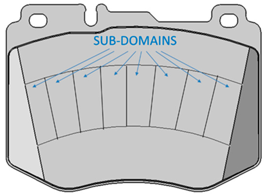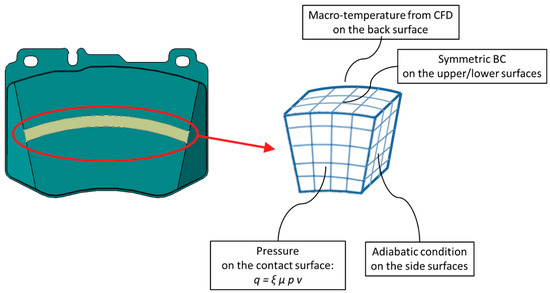 The simulated area is a band along the pad as represented in Figure 6. The heat transfer is set on the surface in contact with the disc, while on the back of the simulated portion the macro-temperature coming from the thermal-CFD analysis is set. The adiabatic condition is imposed on the inner and the outer sides. A symmetric boundary condition is applied on the upper and lower surfaces. Before every braking, the initial temperature is set as the initial braking temperature coming from the thermal-CFD analysis. The temperature is determined by the heat transfer (see Equation 3) which, in cylindrical coordinates, can be rewritten as: