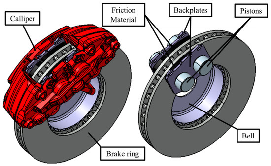 A typical front fixed caliper brake system used by a C-segment car is used in this study. The brake components are shown in Figure 8. The main characteristics of the car and the brake system are reported in Table 1. The specific wear rate of pads and disc, which is obtained by the inertia dyno bench tests, for both the Cu-full and the Cu-free materials are reported in Table 2. The brake system consists of one brake disc, which is composed by a cast iron brake ring and a steel bell; one two-piece fixed aluminium caliper; two pads, each composed by friction material attached to a steel backplate; and four aluminium pistons.