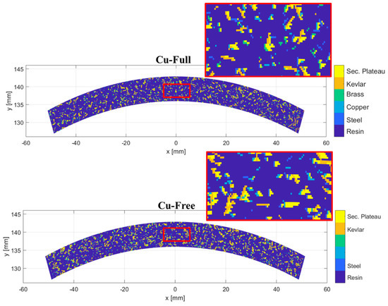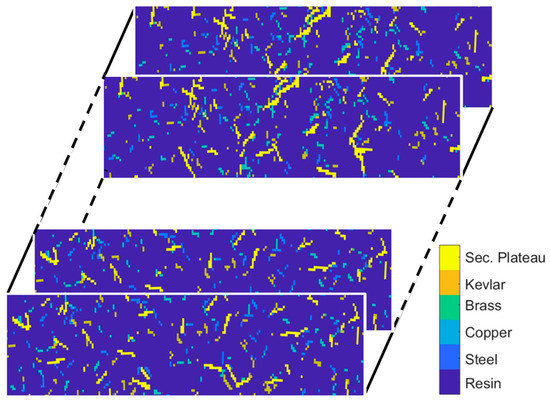 Two commercial pads have been evaluated: one Cu-full and one Cu-free material. The pad friction materials used in the FEA and thermal-CFD simulation have the same macroscopic geometry, but the wear and thermal properties differ. This results in different macroscopic contact pressure distributions and, therefore, temperatures that is used as boundary conditions in the CA. The differences of the pad friction materials in terms of fibre distribution are considered in the CA simulation. The initial surfaces and volumes are generated by using a Matlab script. The script has been developed to generate multiple fibres distributed in the thickness to obtain a 3D grid. The weight percentage of fibres used in the simulation for the two material are presented in Table 4. The 3D generated pad friction material according to Table 4 is shown in Figure 9. The fibre distribution is the same for every two layers in the thickness direction. This means that the fibres are contained into the plane formed by two layers and are not perpendicular to the planes themselves. The number of layers used in the simulation is 20 which corresponds to the number of nodes in z direction. The surface topography of the pad contact surface is randomly generated with the same script. As initial condition all the fibres are set at the maximum height, which means that they are potentially in contact, while the homogeneous material height is randomly set with a maximum depth of 50 µm. The initial surface topographies are shown in Figure 10, respectively, for Cu-full (above) and Cu-free (below).