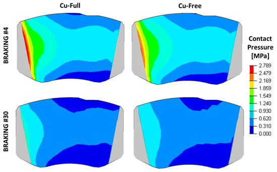 The contact pressure distributions during braking #4 and #30 are shown in Figure 11 for the pad on the external side of the caliper. The system fluid pressure for the two brake events are 2.0 and 1.0 MPa, respectively. The pressure on both the friction materials has a peak on the left chamfer edge. In general, the pressure distributions for the two friction materials are qualitatively similar.