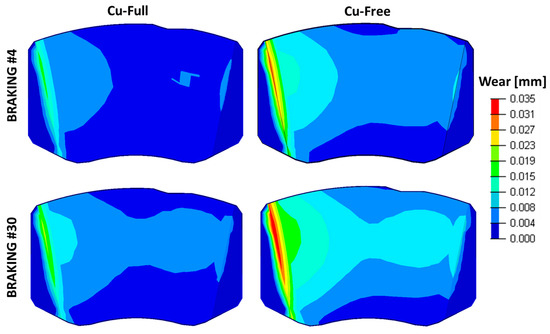 The wear after braking #4 and #30 is shown in Figure 12. The wear is higher for the Cu-free material and the wear is higher on the edge of the chamfer due to the higher contact pressure. The cumulative mass lost during the test cycle is shown in Figure 13. The mass loss of the Cu-free pads-disc couple is higher compared to the one of the Cu-full pads-disc couple. In particular, the Cu-free pads loose around twice the mass of the Cu-full ones. Note that the wear is considerably higher during the cleaning block than the first block.