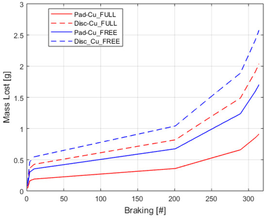 Cumulative mass lost during braking. Red lines: Cu-full material; blue lines: Cu-free material; continuous: line pads; dashed: lines disc.