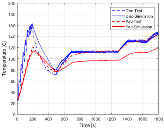 A comparison between experimental and simulated results in the thermal-CFD analysis for the disc and the Cu-full pad temperatures is shown in Figure 14. The blue lines represent the disc temperature; the simulated disc temperature (continuous blue line) is aligned with the experimental one (dashed blue line) during all the braking considered. Note that only the cooling phase between the cleaning and the first group between around 200 and 500 s is underestimated. The simulated pad temperature (continuous red line) is in line with the experimental one (dashed red line) during the cleaning phase, but it is slightly underestimated during all the first group braking.