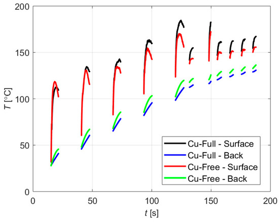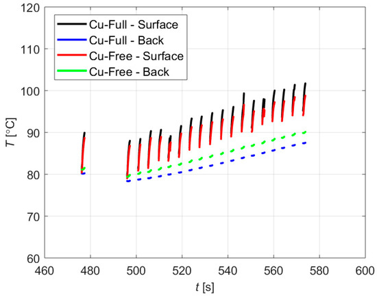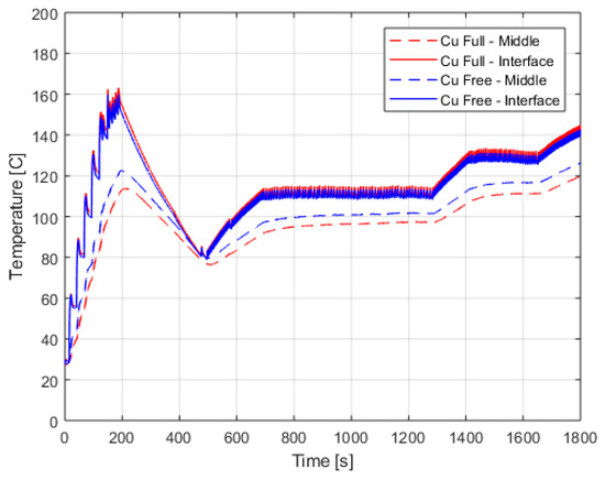 The simulated mean temperatures for the Cu-full and Cu-free pads during the cleaning section of the test cycle is shown in Figure 16 and for Sections 1.1–1.2 in Figure 17. The temperature at the back of the simulated volume is higher for the Cu-free material due to the higher diffusivity of the Cu-free material itself. The Cu-free contact temperature starts from a lower value and becomes higher compared to the Cu-full one.