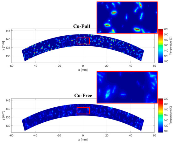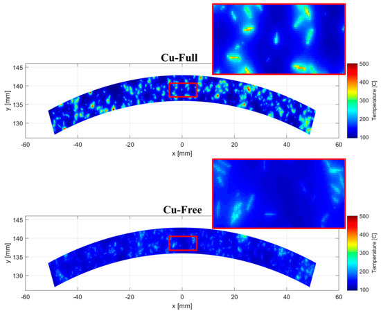 Pad surface temperature distributions after brake event #4 for the Cu-full and Cu-free materials. Disc rotation counter: clockwise.