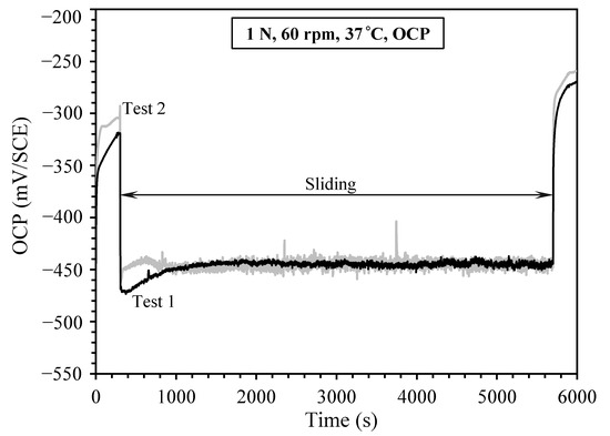Recorded open circuit potential (OCP) before, during and after sliding under a contact load of 1 N in 0.9% NaCl solution at 37 °C, for two repeated tests.