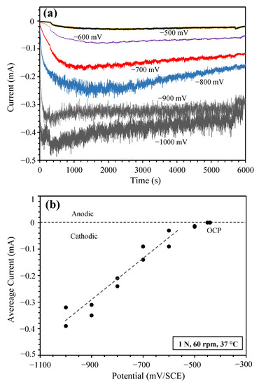 After establishing the OCP (−450 mV (SCE)) during sliding, a series of sliding tests were conducted potentiostatically at cathodic potentials ranging from −500 MV (SCE) to −1000 mV (SCE). Cathodic potentials more negative than −1000 mV (SCE) were not used in this work because tribocorrosion tests are rarely conducted under such conditions. Figure 2a shows the current transient curves recorded at 1 N load. Clearly, at all the applied potentials, the recorded currents were negative. At each potential, during the first 300 s immersion without sliding, the value of the negative current increased with time (i.e., the current shifted downwards in Figure 2a). During sliding, the value of the negative current increased first and then decreased. Figure 2a also shows that despite the noticeable scatter in cathodic current at each potential, there is a clear trend that the value of the cathodic current increased with increasing cathodic potential. At −500 mV (SCE), which was close to the OCP and was in the transition region between anodic dissolution and cathodic reduction, the value of the negative current was very small, around −0.01 mA. Increasing the value of cathodic potential to −1000 mV (SCE) increased the negative current to around −0.4 mA, which is 40 times the value at −500 mV (SCE). Figure 2b shows the average negative current measured during sliding at various applied cathodic potentials. As expected, the value of the negative current increased with increasing cathodic potential in the range between −500 mV (SCE) and −1000 mV (SCE) tested in this work.