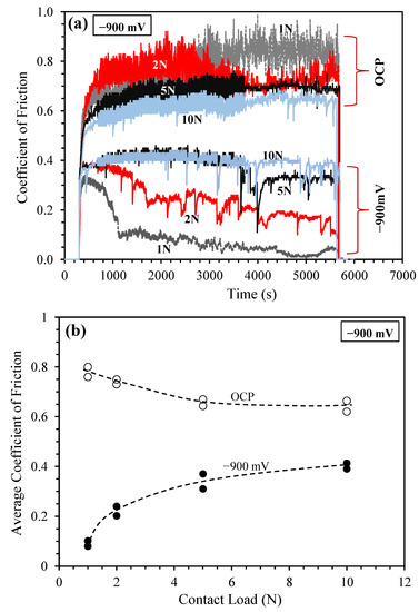 (a) Recorded COF curves at OCP and at −900 mV (saturated calomel electrode, SCE) under various contact loads; and (b) measured average COF as a function of load.
