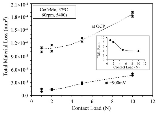 TML versus contact load, measured from the sliding tracks after sliding at −900 mV (SCE) for 5400 s under various contact loads from 1 N to 10 N. The inset shows the ratio of TML at OCP to TML at −900 mV (SCE) as a function of load.