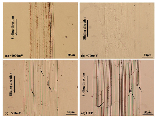 Microscopic images of the sliding tracks generated under 1 N load at OCP and various applied cathodic potentials. The small arrows indicate the terminated scratches with third-body particles. (a) −1000 mV, (b) −700 mV, (c) −500 mV and (d) OCP.
