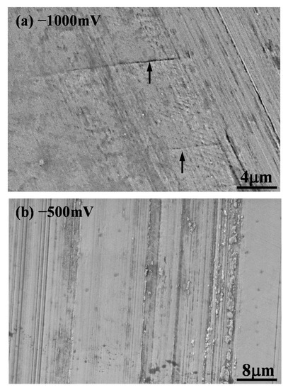 Another group of sliding tracks include those produced at potentials more negative than −600 mV (SCE) (Figure 7a,b). These sliding tracks were characterized by two distinct features, i.e., (1) the existence of fine scratch marks caused by the micro-abrasion of the counterface, and (2) the presence of many parallel lines which were inclined to the sliding direction. Most of these lines could hardly be observed under microscopes. Only through very careful examination by slightly adjusting the focus could the lines be revealed clearly. These lines were formed across the sliding track and did not extend far beyond the track. Figure 8a shows a high magnification SEM image revealing two parallel lines with a spacing about 9 μm on the −1000 mV (SCE) sliding track. It is also noted from Figure 8a that the line opening was very narrow, about 0.1 μm, which has imposed some difficulty in revealing the lines under microscopes. Figure 8b shows an SEM image of the sliding track generated at −500 mV (SCE). Clearly, no such lines were observed in the sliding track which was populated with abrasion marks with accumulated wear particles which could serve as third-body abrasives during the sliding process.
