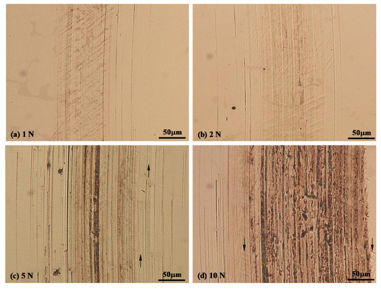 Similarly, the sliding tracks produced at −900 mV (SCE) under various contact loads can also be divided into two groups (Figure 9). The sliding tracks produced under relatively small loads, e.g., 1 N and 2 N, belong to one group, which were characterized by the existence of fine and parallel micro-abrasion marks and the presence of parallel lines across the sliding track (Figure 9a,b). On the other hand, the sliding tracks produced under higher loads, e.g., 5 N and 10 N, belong to another group (Figure 9c,d), which were characterized by the existence of wider and deeper scratch marks in the central region of the track, where no such lines were observed. However, near to the edges of these sliding tracks, where the scratch marks were finer and abrasive wear was less severe, such lines could be observed (arrowed areas in Figure 9c,d). Thus, it is likely that such lines also formed across the sliding tracks under 5 N and 10 N loads, but in the central area of the track, the lines were removed due to enhanced material removal in this region.
