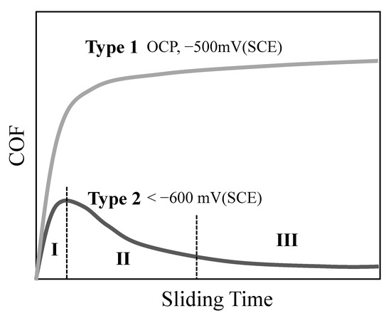 The investigated CoCrMo alloy is a passive alloy with an oxide film before the sliding tests. During sliding, the oxide film is damaged or even removed such that the OCP is cathodically shifted from around −320 mV (SCE) to −450 mV (SCE). Sliding tests at cathodic potentials ranging from −500 mV (SCE) to −1000 mV (SCE) in this work illustrate that the friction and wear behaviour depends on the cathodic potential and the load applied. The friction behaviour can be divided into two types, as evidenced in Figure 3a and schematically illustrated in Figure 10. Type 1 is characterized by the gradual increase in COF during the early stage of sliding to reach a steady state. This frictional behaviour was observed at OCP and −500 mV (SCE). Type 2, which is observed at potentials more cathodic than −600 mV (SCE), is characterised by 3 distinct frictional zones: in Zone I, COF increases with sliding time during the early stage; in Zone 2, COF decreases gradually with time as sliding continues; and in Zone 3, relatively stable and low COF is achieved. The COF values in each zone and the time to reach each zone decrease with increasing cathodic potential.