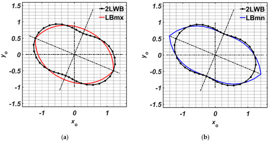 Figure 2a,b show the comparison of the two elliptical clearances LBmx and LBmn, respectively determined according to Equations (6) and (7).