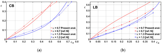 Journal eccentricity ratio vs. the ring eccentricity ratio : comparison to results from [16]. (a) CB geometry. (b) LB geometry with = 0.5.