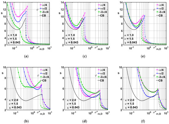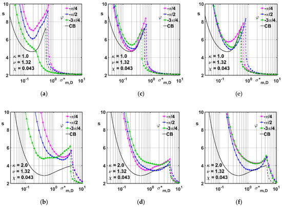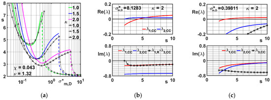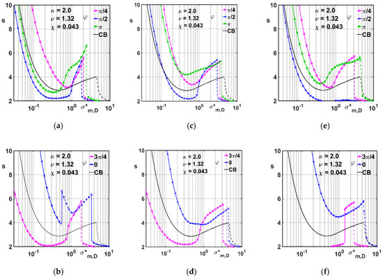When = 2 (Figure 9a–f) a higher spread, with respect to the results of Figure 8a–c, is observed in the stability performances. Angular positions with and yield a remarkable lowering of the limit curves. This circumstance is particularly evident for the LBmn profile. Conversely, the best performance pertains to the orientation: this horizontal layout of the outer bearing, makes the stability borders in Figure 9b,d,f comparable to the higher branches depicted in Figure 5b,d,f, respectively. Even in this case, this outcome appears more evident when the LBmn shape is adopted. A further comment is to be addressed to the discontinuities exhibited in Figure 9b,f, which could represent, at first glance, numerical artifacts. Nevertheless, an inspection into the behavior of the critical eigenvalues clarifies the point. Figure 10a–e show the partial portraits of the eigenvalues obtained in the interval of rotor speed s, taken at different, close values of the bearing modulus. In particular, Figure 10a–c, relative to a sequence of values around 3.5, show how the critical eigenvalue is initially represented by (Figure 10a,b, top) and successively (Figure 10c, top) by . The passage from the one eigenvalue to the other takes place with a jump in the critical value s* of s, which justifies the right discontinuity in the curve of Figure 9b. Further downward, when is around 0.54 another jump takes place, as confirmed by the left discontinuity in the curve of Figure 9b. Differently from the previous case, the jump in the critical value s* from 6.7 c.a. to 4.2 c.a. when is due to the only eigenvalue, as confirmed by the behavior summarized in the top diagrams of Figure 10d,e.