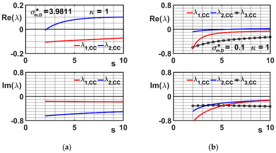 A separate analysis is addressed just to the mentioned 2LWB case with and = 1, in order to throw light onto the characteristic continuity, i.e., without the typical jump from HSR to LSR or vice-versa, exhibited by the corresponding curve in Figure 5a. Figure 6a,b make it possible to assess that represents the critical eigenvalue both in the LSR and the HSR (compare Figure 5a). Owing to coalescences between the different eigenvalues, observed in the Re and Im diagrams at varying in its interval, maintains its position over the zero axis, so that the critical value of (i.e., the speed at which the pair crosses the imaginary axis) varies continuously without jumps and intervention of different eigenvalues. It is also worth noticing that changes its relative magnitude with respect to the other eigenvalues when passing from LSR to the HSR, as it can be inferred comparing the bottom diagrams in Figure 5a,b.
