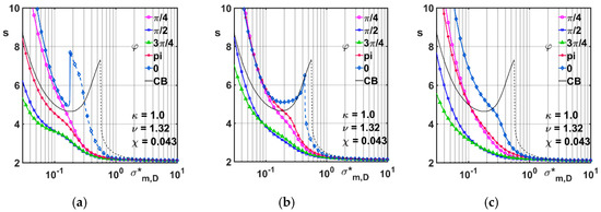 The stability charts obtained with the same parameter values of Figure 5a–f, but adopting a further set of angular positions, i.e., , are reported in Figure 8a–c and Figure 9a–f. The values = 1 and = 2 were respectively adopted in the former and the latter set of figures. A general decay of stability, partly lessened at higher loads, is shared by the different curves, which show substantial similarities in the three, compared geometries. It is apparent that, whatever the noncircular bearing shape, when = 1 the threshold curves for and are positioned quite below the CB curve. Differently, some higher branches of the curves calculated with and overstep the CB stability border when is about less than 0.2. Similar behavior characterize the data for with restriction to the LBmx and LBmn profiles (Figure 8b,c). A further remark can be made about the shape of the curves, which are deprived of distinct separation between the HSR and LSR, with the only exception of the 2LWB and LBmx branches at .
