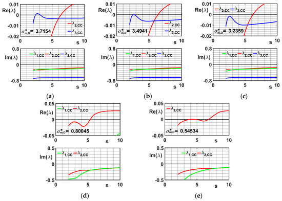 Behavior of the eigenvalues (partial portraits) related to the curve in Figure 9b, taken at successive values of . (a–c): sequence involved in the right discontinuity about = 3.5; (d,e): sequence involved in the left discontinuity about = 0.54.