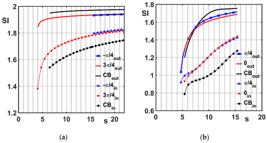Figure 11a,b depict the behavior of the SI index respectively for the above Set1 and Set2 conditions. Each curve in the diagrams starts at a speed value that is generally not coinciding with the exact critical one, but turns out to be placed just downstream of it, owing to the step resolution and the fact that the index assumes null values in the presence of equilibrium points. The SI behavior shown in the plots makes it possible to infer that: