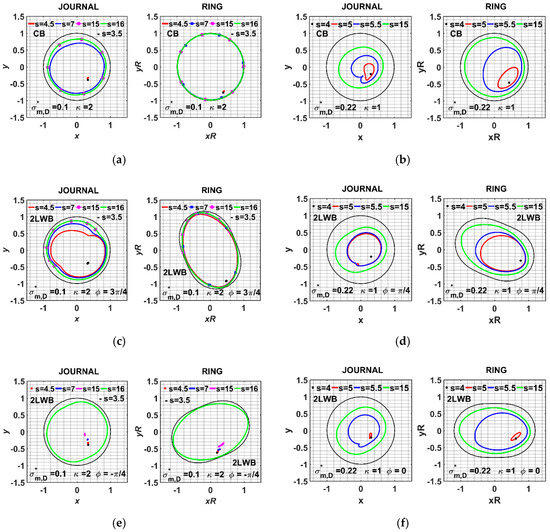 An insight into the results presented in Figure 11a,b can be achieved through inspection of the trajectories described by the journal and ring centers at different speeds and depicted in Figure 12a,c,e, for conditions of Set 1, and in Figure 12b,d,f for the Set 2 ones. A first indication about the stability performances that pertain to the different layouts, is obtained by noticing the long-lasting permanence of the equilibrium point at speed increase, which manifests in some cases with respect to the other ones. This remark complies particularly with the behavior of the 2WLB − reported in Figure 12e. The wide orbits of the centers, detected for s = 16, contrast with the minute orbits obtained when s = 15. Differently, the other two geometries analyzed under the same Set 1 conditions (Figure 12a,c) turn out to exhibit big orbits well before, when s = 7.