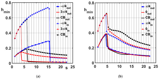 The brief portrait given in the present section is completed here below with an observation of the minimum thickness behavior, as reported in Figure 13a,b. The whole curves in the plots present an initial branch that raises with the rotor angular velocity, from the initial s = 2 value up to the critical speed. This behavior is justified by the gradual centering of the steady equilibrium points within the bearing clearances, which evolves as far as the speed is increased. The difference in the loading conditions from Set 1 and Set 2 explains the different range of values pertaining to the curves reported in the lower part of Figure 13a,b and relative to the inner bearing. It is worth observing that the minimum thickness assumes practically the same values, whatever the FRB layout in the examples. The curves shows quite clearly the jump that is due to the stability loss, with indications that agree with those inferred from Figure 11 and Figure 12. The significant jumps that affect the minimum film thickness in the inner bearing under Set 1 are also worth of remark. This outcome appears to be reasonably explained in terms of the said equilibrium point-centering and load condition effects. The example represented by the 2WLB − case in Figure 13a is representative in this regard.