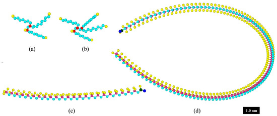 The three fluids formulated above were modeled using MD simulations. Consistent with previous gas chromatography-mass spectroscopy measurements, PAO4 was modeled as equal parts 1-decene trimer and tetramer and PAO8 was modeled as 1-decene tetramer [60]. The PIB1300 polymer was built from 22 isobutylene monomers and an exo group so that the resulting molecule had a nominal molecular weight of 1300 g/mol and a bromine number of 12, indicating it was a linear olefin with one unsaturated bond (CH) [61]. Similarly, the PIB6000 polymer comprised 106 isobutylene monomers and an exo group so that the resulting molecule had a nominal molecular weight of 6000 g/mol and a bromine number of 3, indicating it was a linear olefin with one unsaturated bond (CH) [61]. The virtual models of the 1-decene molecules and PIB polymers are shown in Figure 2.