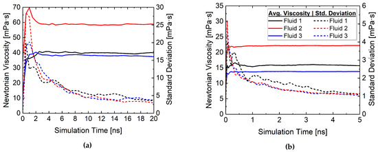 First, the Newtonian viscosity of fluids was modeled using equilibrium molecular dynamics (EMD). Specifically, we used the Green–Kubo (GK) approach, which relates the viscosity to the time integral of the stress autocorrelation function [51,52]; see Section S3 for details. Using the previously equilibrated model, simulations were equilibrated again for 2 ns in the NPT ensemble followed by NVE ensemble production runs. The pressure tensor components were saved every 5 fs for 5 ns at 50 C and 20 ns at 80 C during the NVE simulation. An average low-shear viscosity value was calculated from multiple NVE trajectories and by applying the GK formalism following the time decomposition approach [52].